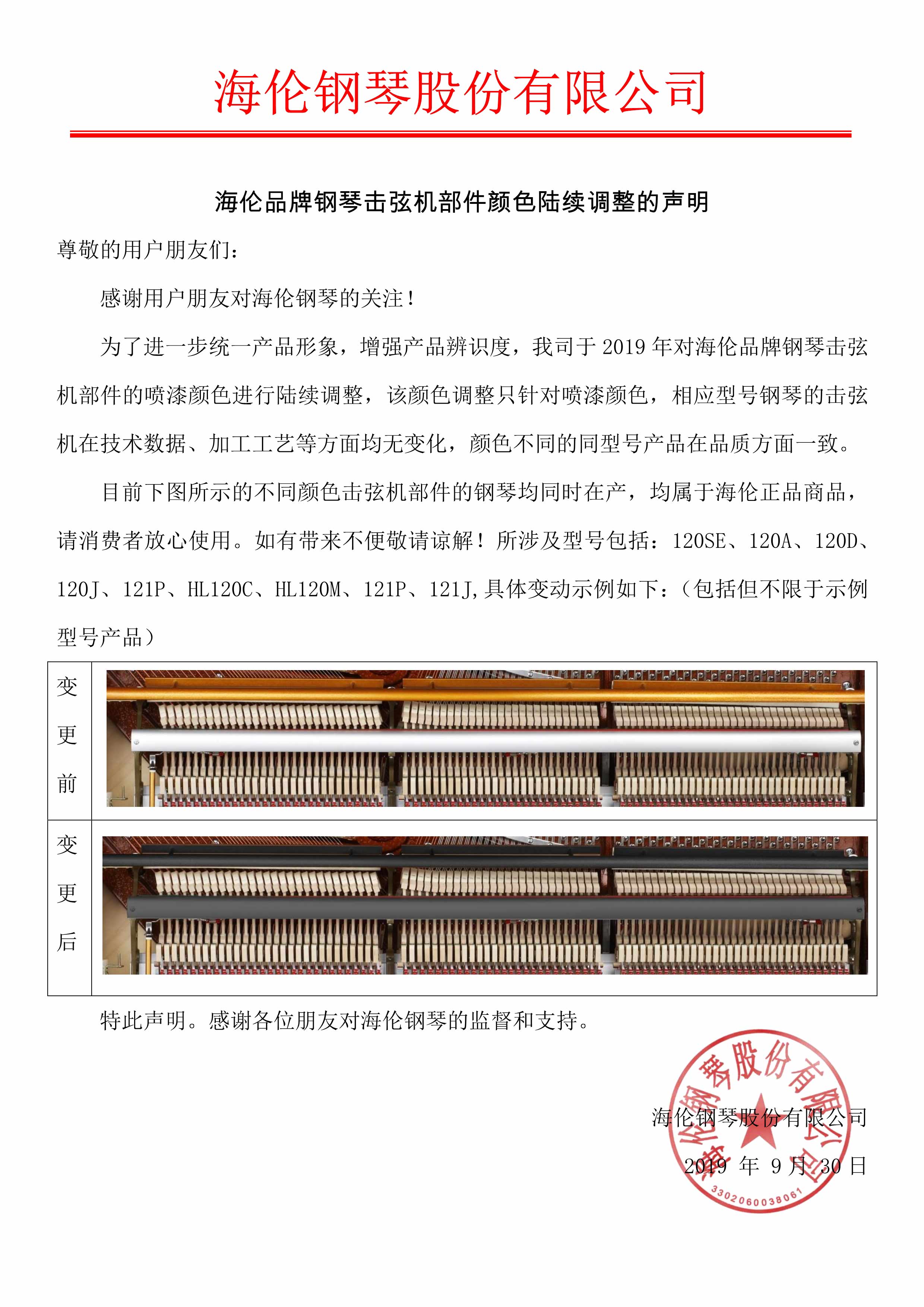 2019年海倫公司關(guān)于海倫鋼琴擊弦機配件顏色聲明