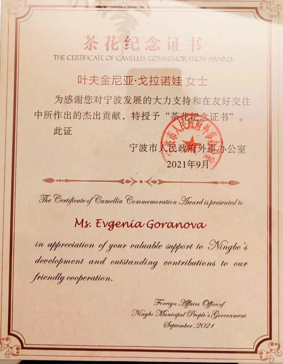 “茶花友誼證書”“茶花紀念證書”是我市專門為對寧波經濟建設和社會發展作出突出貢獻的外國專家設立的。今年,海倫音樂中心葉夫金尼亞·戈拉諾娃等8位在甬外國專家獲得“茶花紀念證書”。